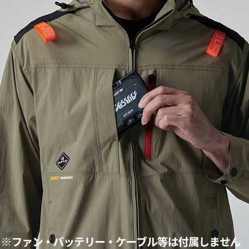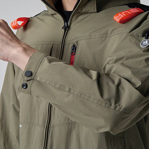 スポーティなルックスとワークスペックの機能性をブレンドしたサイドファンモデルはデイリーからワークユースまで様々なシチュエーションにフィット ●風がボディ全体を駆け巡るサイドファン取付設計モデル●遮熱効果(-8度)に優れたアルミコーティング加工と軽量、撥水性を備えたソフトシェル素材●背ヨークに保冷剤(別売)を収納可能な通気エアダクトポケットを装備●ヘルメット収納フード(着脱可能)、フックハンガー、背ランヤードホールを配備しフルハーネスに完全対応●男性ユニセックスの着用に対応
