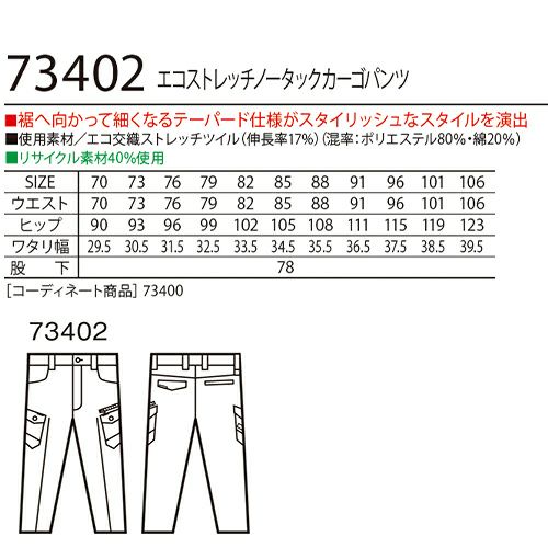 エコ・ストレッチ性を兼ね備えた、スタイリッシュ&カジュアルワークウェア。 再生糸を使用しSDGsに対応。伸縮性に優れたストレッチポリエステル高混率T80/C20素材。ズボンはテーパード仕様で裾へ向かって細くなり、スタイリッシュなスタイルを演出。