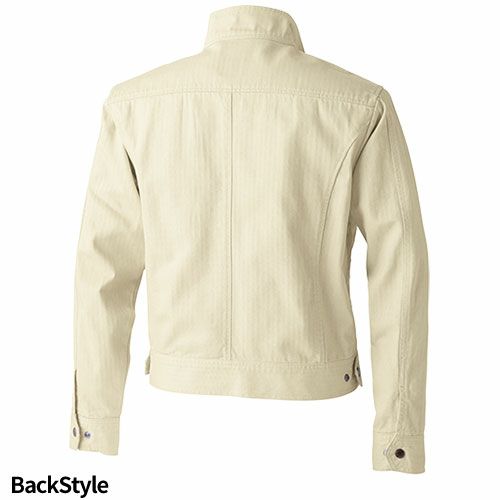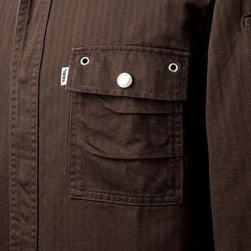 フロント部は比翼仕立てのためボタンが見えず、すっきりとした雰囲気要所に施されたメタルのドットボタンがワイルド感を強調します。ナチュラルな色合いと風合い、そして堅牢さが調和した一着です。