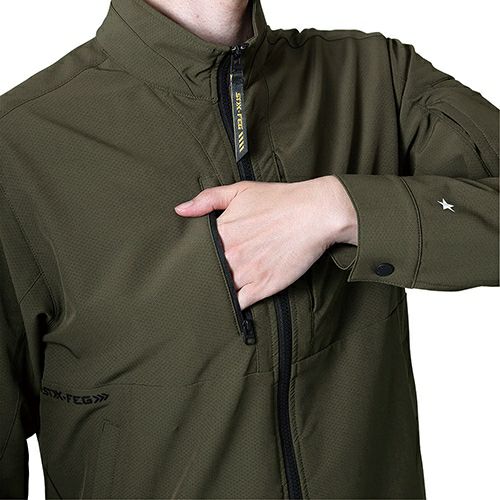 胸元の3本ステッチやファスナーの配置が印象的!ストレッチ素材使用で動きやすいワークウェア 胸ポケットやカーゴポケット等、収納力はもちろん、生地の伸縮性を生かした機動力など機能性にも配慮しています。