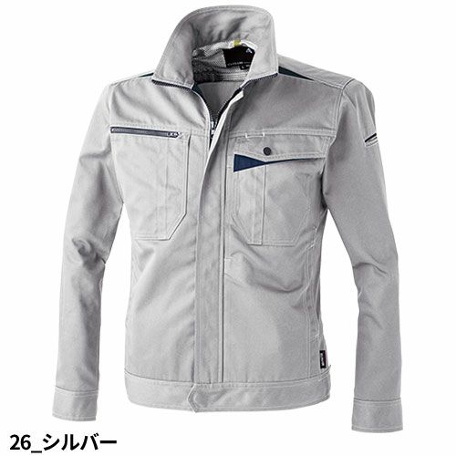 帯電防止JIS T8118適合のT/Cストレッチスラックス!スタイリッシュなシルエットとストレスフリーを実現機能性も十分な納得のクオリティ 伝統的な機能性を進化させつつ、シルエットにもこだわったT/Cストレッチシリーズ静電気対策が必要な現場でも着用できるように帯電防止JIS T8118に適合しています。ストレッチ生地をベースに、ジャケット背面にはノーフォークを、肘膝にはタックやダーツを備えることで動きやすさを向上させています。収納力についても定番のポケットの他に、ジャケットでは左胸スラッシュポケット、パンツでは右脇にファスナーポケットを備えています。また、ジャケット・パンツ共に背面に反射パイピングを施し暗所での安全性も確保しています。