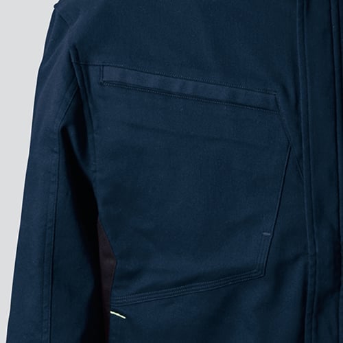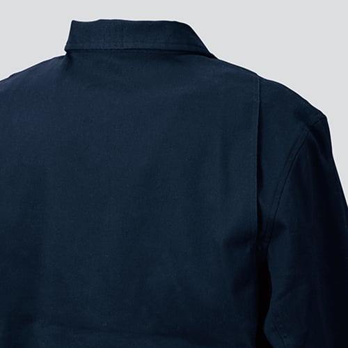 ストレッチ性を付与した制電対応綿素材 ストレッチ素材を活かし、定番スタイルながら野暮ったさを払拭、制電糸を使用し、大型ポケットを設けることで多様な用途に対応
