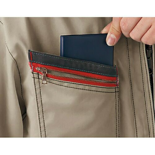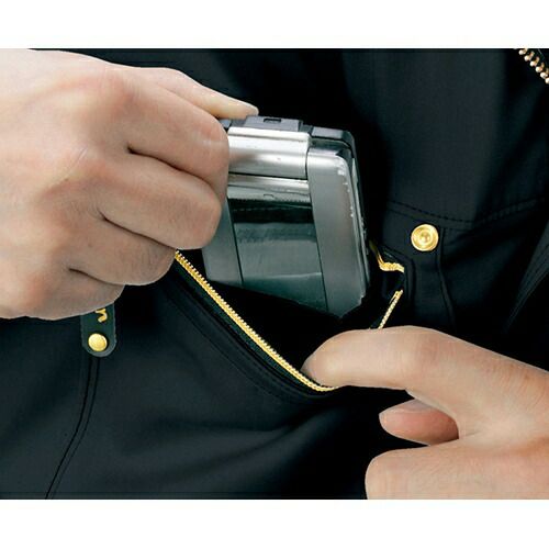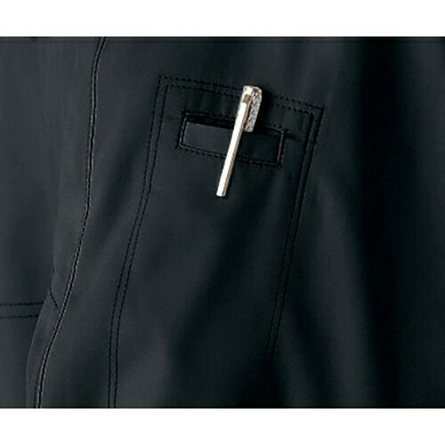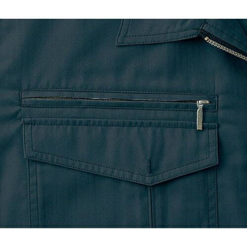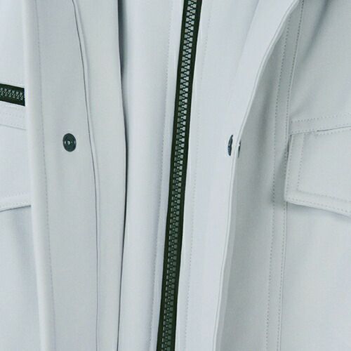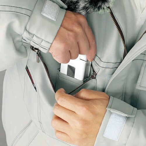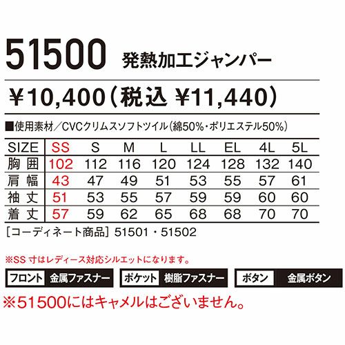 ゴールドのファスナーとボタンが抜群の存在感を発揮。 シャープなデザインに加えて発熱加工素材を採用したウォームビズ対応ワークウエア。 未加工布に比べて1?2℃温かい発熱加工素材(D.P.コット)を採用。