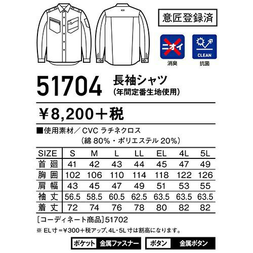 自重堂 Jawin 作業服 51704 長袖シャツ 秋冬 メンズ 作業着 長袖 ワークウエア 通年 ワークシャツ