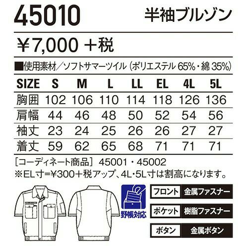 自重堂 作業服 45310 半袖ブルゾン 春夏 ユニセックス メンズ・レディース対応 作業着 ブルゾン