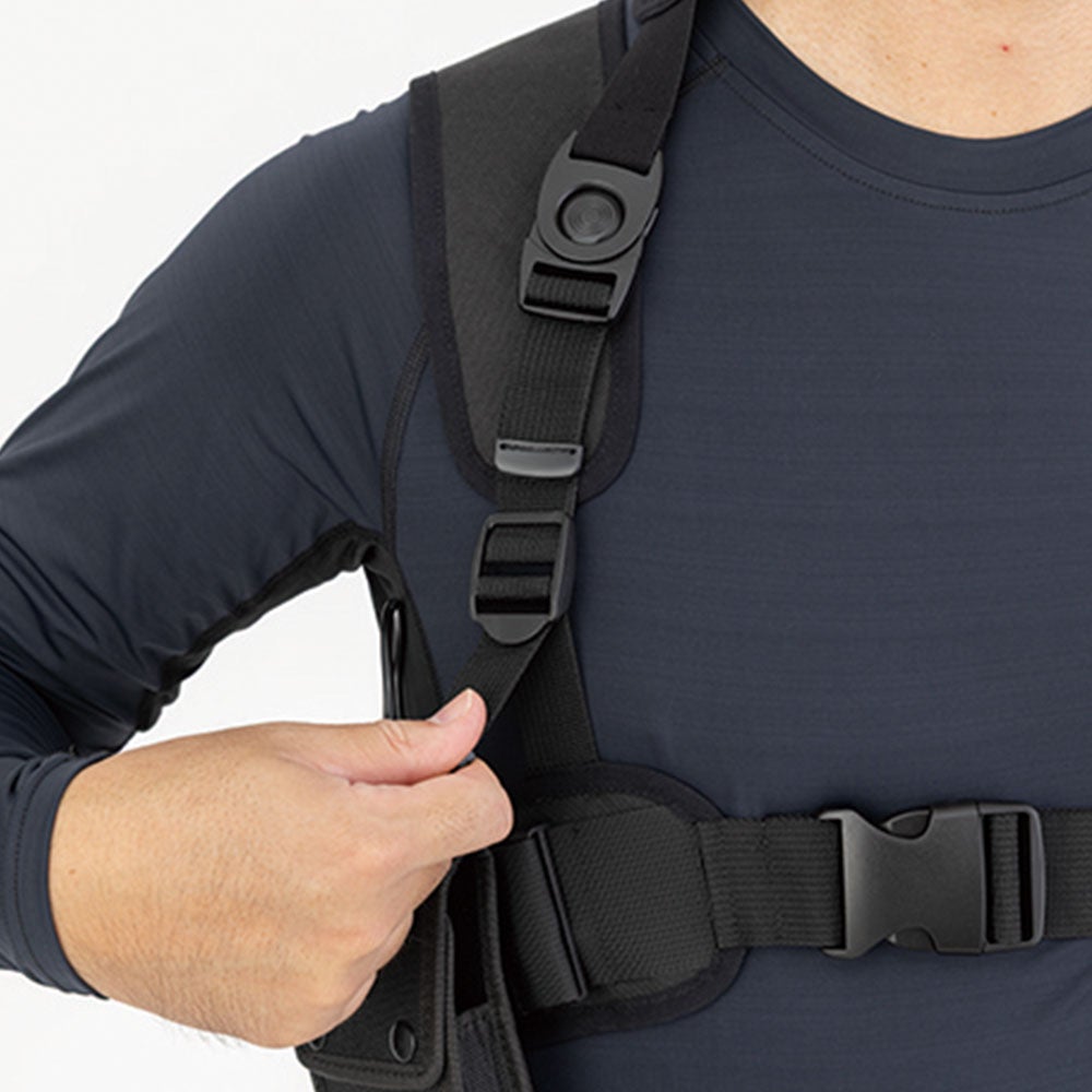 高所作業もこれ一着。フルハーネス対応×上部ファン×遮熱の半袖空調服。 フルハーネス装着対応の上部ファン仕様遮熱半袖空調服。背中の取り出し口でハーネスのD環を外に出したまま着用可能。肩補強当て・胸フックかけ・Dカン・クイックファスナー・ファン落下防止メッシュを装備し高所作業の安全性を確保。遮熱-5℃・UPF50+付き。(2026SS新商品)