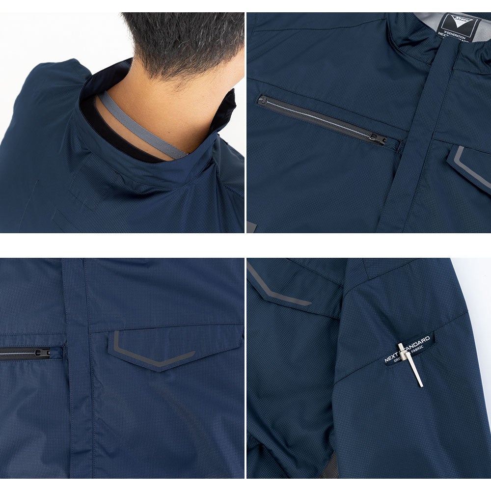 スタイリッシュな細身シルエットとドライタッチが融合。デニム調カラーで現場もオシャレに決まる春夏ジャケット。 綿高混率素材の肌面点接触構造でべたつきを解消しながら、スリムで洗練されたシルエットを実現。カジュアルライクなデニム調カラーが揃い、US1802カーゴパンツとのセットアップで統一感あるスタイルに仕上がる2026SS新作ジャケット。