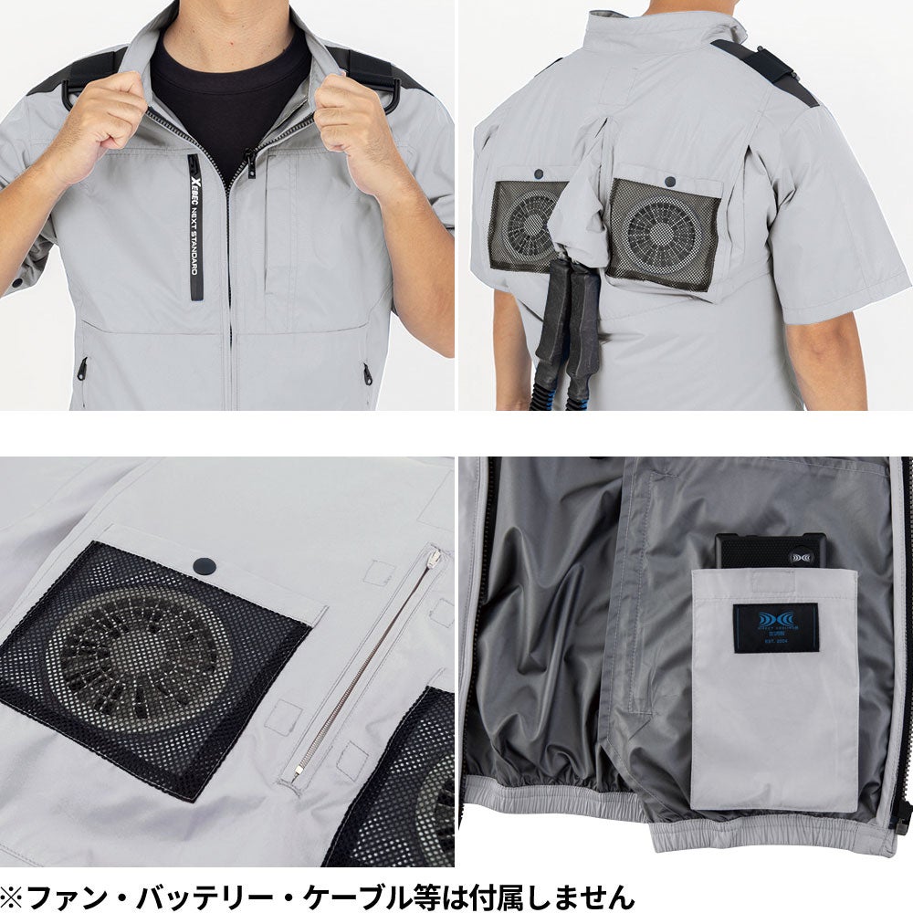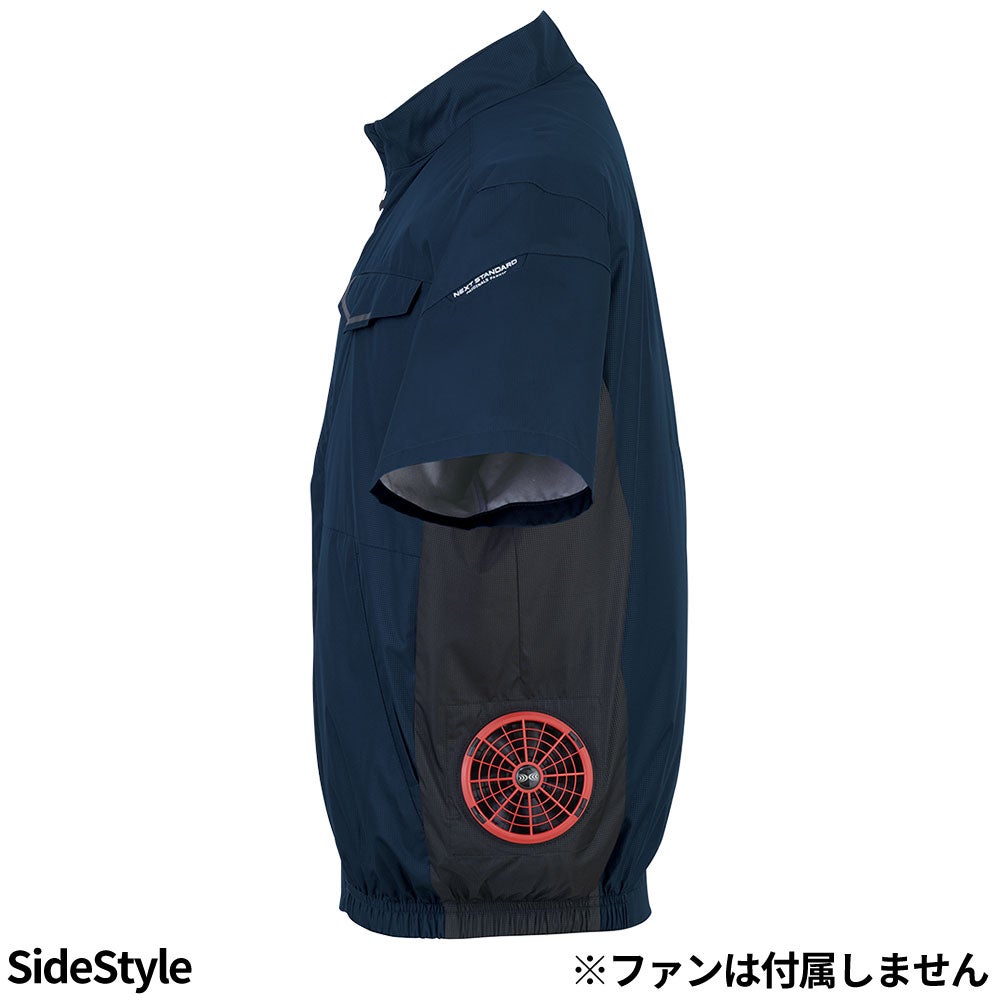 CO2由来エコ素材×遮熱-5℃×JIS制電。サイドファン仕様のエコ遮熱半袖空調服。 XE98037の半袖モデル。CO2由来の高密度ポリエステルを使用したエコ空調服。遮熱コーティング(-5℃)とUVカット(UPF50+)、JIS T8118帯電防止適合。ファン位置が脇側のサイドファン仕様で運転中・着座中も快適。背中内側に保冷剤ポケット付き。(2026SS新商品)