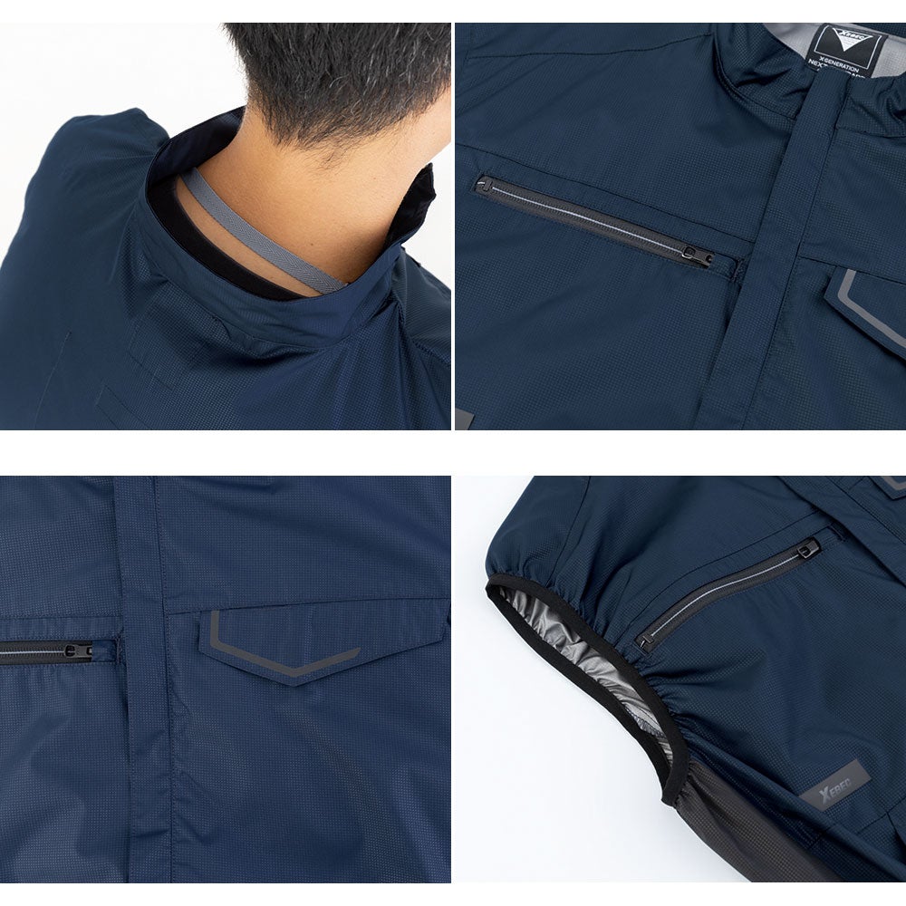 腰まわりの道具と干渉しない。背中・首元集中冷却の上部ファン遮熱ベスト。 XE98035の上部ファン仕様ベストモデル。腰回りの工具類の邪魔にならない上部ファン設計で、背中と首元を集中冷却。遮熱-5℃・UPF50+装備。袖口はニットバインダー仕様で冷風が効率よく循環。両脇ファスナーポケット付きで収納力も確保。(2026SS新商品)