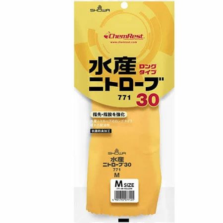 他の画像を見る ゴム手袋 水産ニトローブ30 ロングサイズ [10双入] 品番:No.771 (M・L・LLサイズ) ショーワグローブ (作業用手袋) ビニール手袋 ロング 裏布付き 食品衛生法適合品 耐油性 耐薬品性 突き刺しに強い 破れにくい 耐熱性 ニト 二トリルゴム手袋 SHOWA 特別価格 ¥ 7,071 税込 水産ニトローブのロングタイプ。 ・ニトリルゴムをコーティングしているため、油に強く、摩耗強度にも優れています。・傷つきやすい指先を4重コーティングで強化。・特殊加工(粒子付き)で、高いスベリ止め効果を発揮。・裏布は、メリヤス編みの縫製手袋。・傷つきやすい親指と人差指の指股部分の縫い目をずらした独自の製品設計。・裏布は抗菌防臭加工で、繊維上の細菌の増殖や汗などによる臭いを抑制。 詳細を見る お気に入りに登録する