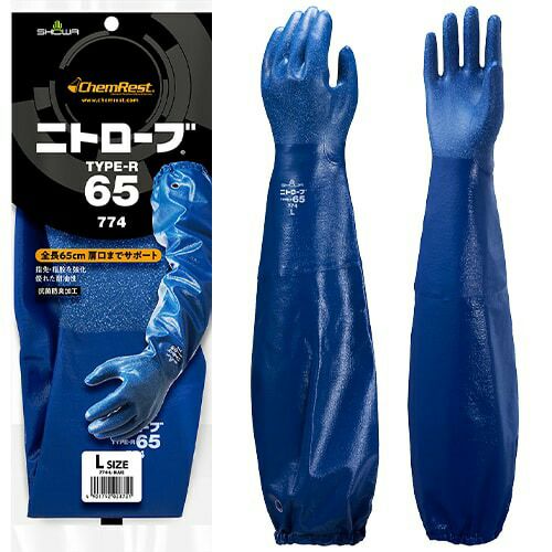指先から肩口まで、継ぎ目なくコーティングした一体型です。そのため、手袋と腕カバーの接合部分から破れてしまう心配がなく、上腕部分まで丈夫です。