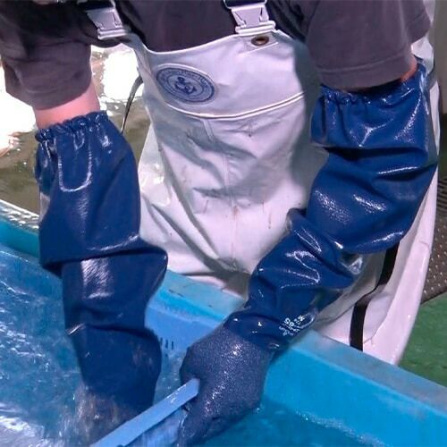 他の画像を見る SHOWA ショーワグローブ 水産ニトローブ type R-65 5双 774 二トリルゴム手袋 裏布あり ゴム手袋 特別価格 ¥ 9,158 税込 肩口までのロングタイプ。継ぎ目のない一体型で丈夫耐油性・耐摩耗性に優れた 「ニトローブ」シリーズ ・継ぎ目のない、丈夫な一体型指先から肩口まで、継ぎ目なくコーティングした一体型です。そのため、手袋と腕カバーの接合部分から破れてしまう心配がなく、上腕部分まで丈夫です。・摩耗を軽減する特殊設計傷つきやすい指先および親指と人差指の指股部分は、縫い目の位置を工夫した特殊設計により強化しています。・指先は4重コートで強化特に傷つきやすい指先は4重コートで強化しています。・丈夫なニトリルゴム製コーティングには油や摩耗に強いニトリルゴムを採用しています。・粒子付きのスベリ止め加工大小の粒子が高いスベリ止め効果を発揮します。 詳細を見る お気に入りに登録する