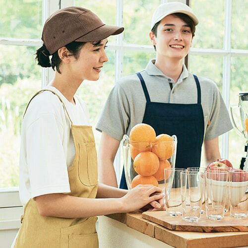 天然色素で合成繊維を染めた「Onibegie」は、環境に配慮したエコ素材。野菜や植物から生まれたナチュラルなカラーは、紫外線の反射が少なく、目にも優しいユニフォームです。 アクティブな印象のキャップで、お店のイメージアップ。体に馴染むソフトな風合いのツイル素材。