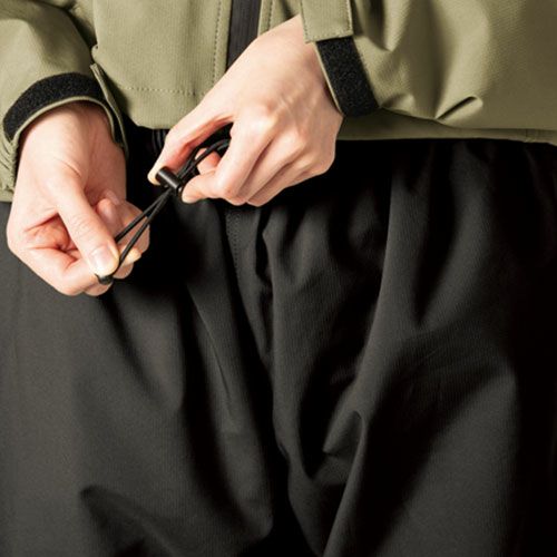 タフな防水力と快適を両立。全天候型レインパン 耐摩耗摩擦に優れベタつきにくい3層構造耐水圧 15000mmH2O、透湿度 15000g/m2-24h非フッ素撥水「PFASフリー」有機フッ素化合物を使用しない環境に配慮した撥水剤を採用しています。
