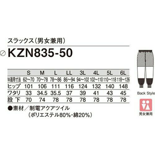 衛生衣 スラックス 男女兼用 パンツ ズボン KAZEN カゼン KZN835 食品衛生白衣 白衣 食品白衣 作業用 作業服 作業着 制服 ユニフォーム 食品加工 食品 工場 給食 調理 厨房 男性 女性 常温作業 吸汗 速乾 制電