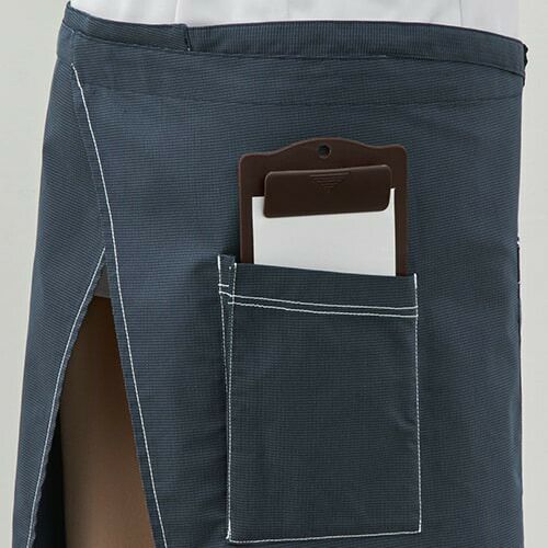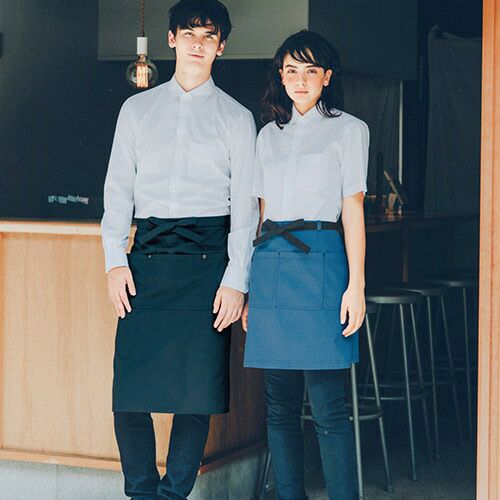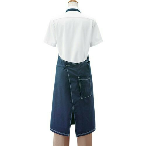 デニム調なのにこの軽さ!白いステッチが効いたシックなエプロン。 デニムライクでありながら軽量で疲れにくく、忙しい現場で活躍します。肩紐ボタン調節やマルチポケット付きなど、機能性とファッション性を併せ持つ優れたアイテムです。