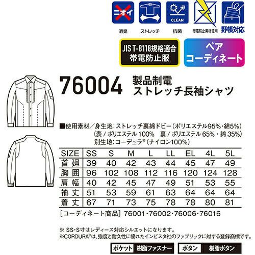 自重堂 Z-DRAGON 作業服 製品制電 ストレッチ長袖シャツ 76004 作業着 春夏 2020年春夏新作 JIS T8118 コーデュラ 消臭 抗菌 帯電防止 ジードラゴン ユニセックス 男女兼用 メンズ レディース