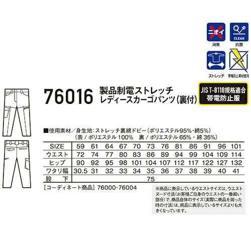 自重堂 Z-DRAGON 作業服 製品制電 ストレッチレディースカーゴパンツ 76016 作業着 春夏 2020年春夏新作 JIS T8118 消臭 抗菌 帯電防止 ジードラゴン