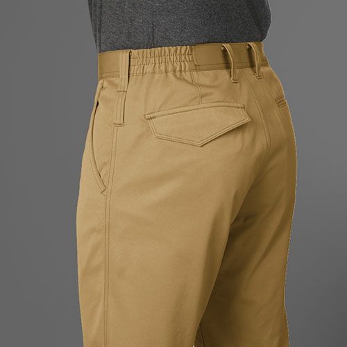 すっきり穿けるNEWピタリティ シンプルデザインのブルゾンに対応したノータック仕様のすっきりシルエットのスラックス。ウエスト帯の両サイド内側に新二重ゴム構造のNEWピタリティウエストゴムを採用し、見た目スッキリ、穿き心地ラクラク。