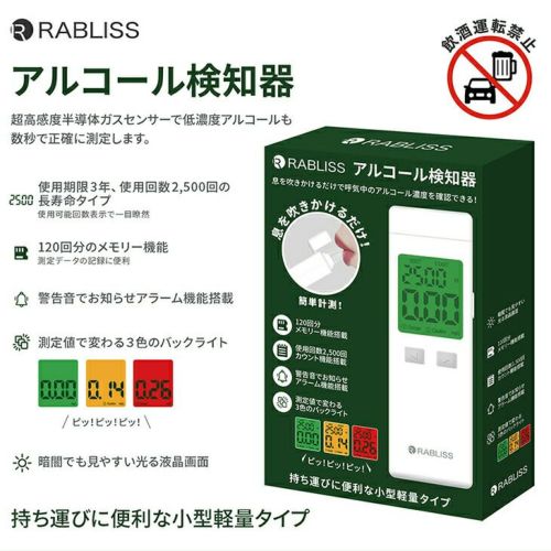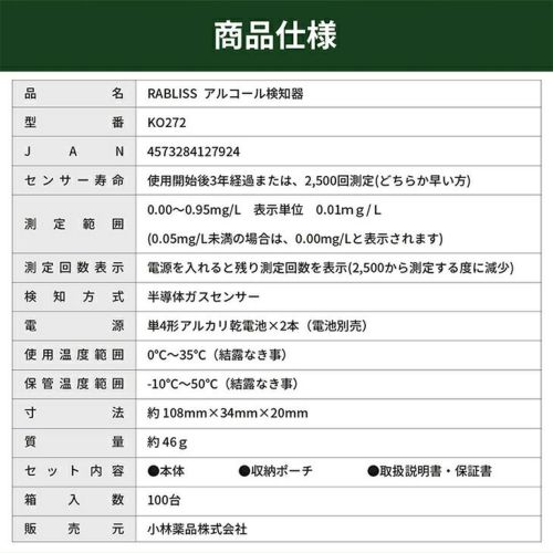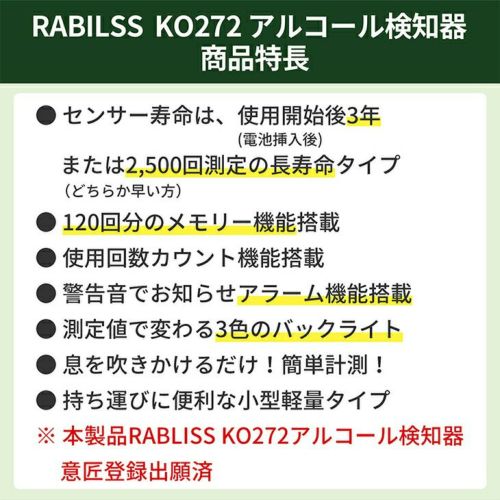 即日発送 送料無料 アルコールチェッカー 業務用 小林薬品 RABLISS メモリー機能 2500回 飲酒 検知器 義務化 吹きかけ 警察 濃度 検査 測定 小型 記録 道路交通法 KO272 精度 簡単 軽量 飲酒運転防止 携帯 飲酒チェッカー