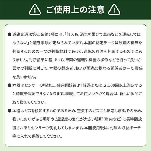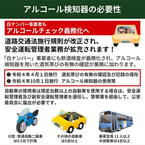 白ナンバー事業者の飲酒検査義務化に対応。国家公安委員会が定めるアルコール検知器としてご使用いただけます。 道路交通法施行規則が改正され、安全運転管理者業務が拡充されます。「白ナンバー」事業者にも飲酒検査が義務化され、アルコール検知器を用いた酒気帯びの有無の確認が業務に加わります。・令和4年4月1日施行 酒気帯びの有無の確認及び記録の保存・令和4年10月1日施行 アルコール検知器の使用等