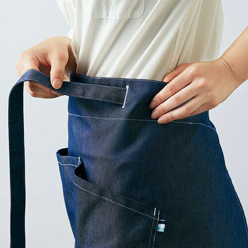好感度の高いトリコロール&マリンデニムやボーダーを使った清潔感のあるシックなマリンテイスト。すっきりとした爽やかな印象で、着こなしの個性が光るカジュアルな装いは、コーヒースタンドやカフェ、ベーカリーと相性バツグン。 デニム調のエプロンはベーシックな後ろクロスタイプ(X型)で、肩ひも3段階調節可能。大きめのポケットはマチ付き。配色のステッチがカジュアル感を演出します。