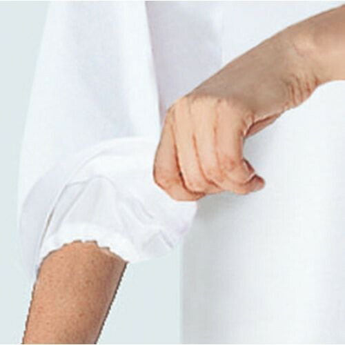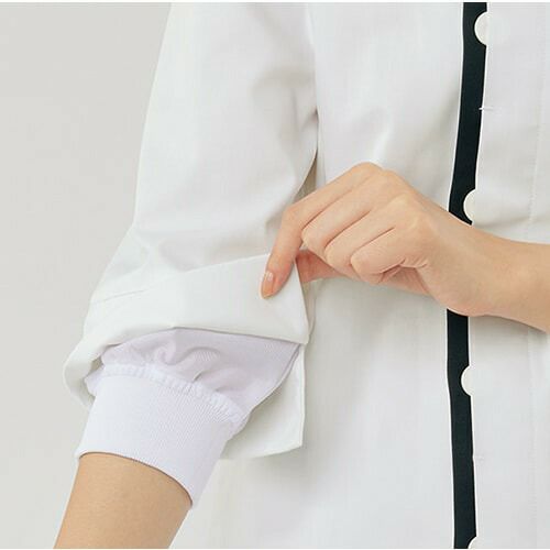 映えるデザインに、調理のしやすさや食への安心をプラス。 カラーのアクセントを効かせた、厨房でも売り場でも映える華やかなデザイン。七分袖で調理しやすく、袖の内側にはネットを内蔵し、異物の落下も防ぎます。