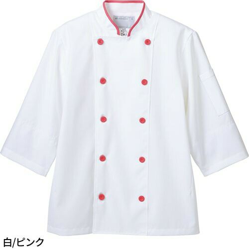 お店の雰囲気に合わせて、オシャレに、可愛く。ボタンと襟のアクセントでおしゃれ感アップ! シンプル&ベーシックなコックコートを、襟もとの太お目のパイピングと、2列に並んだカラーボタンでブラッシュアップ。ピンクやグリーンなら、よりポップ&カジュアルな雰囲気に。